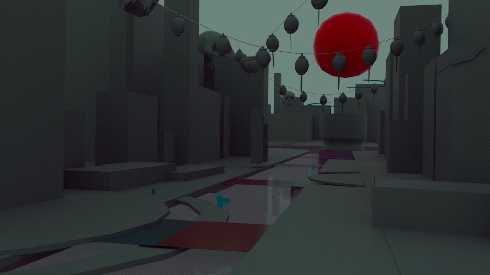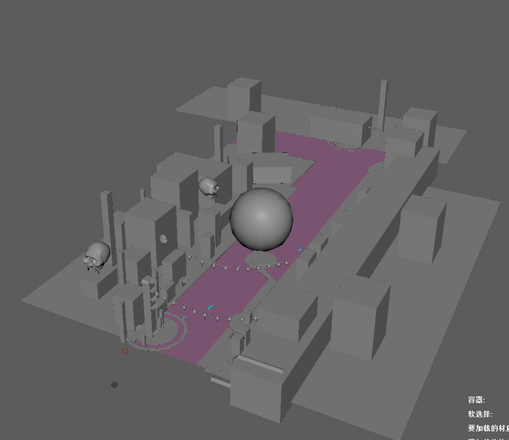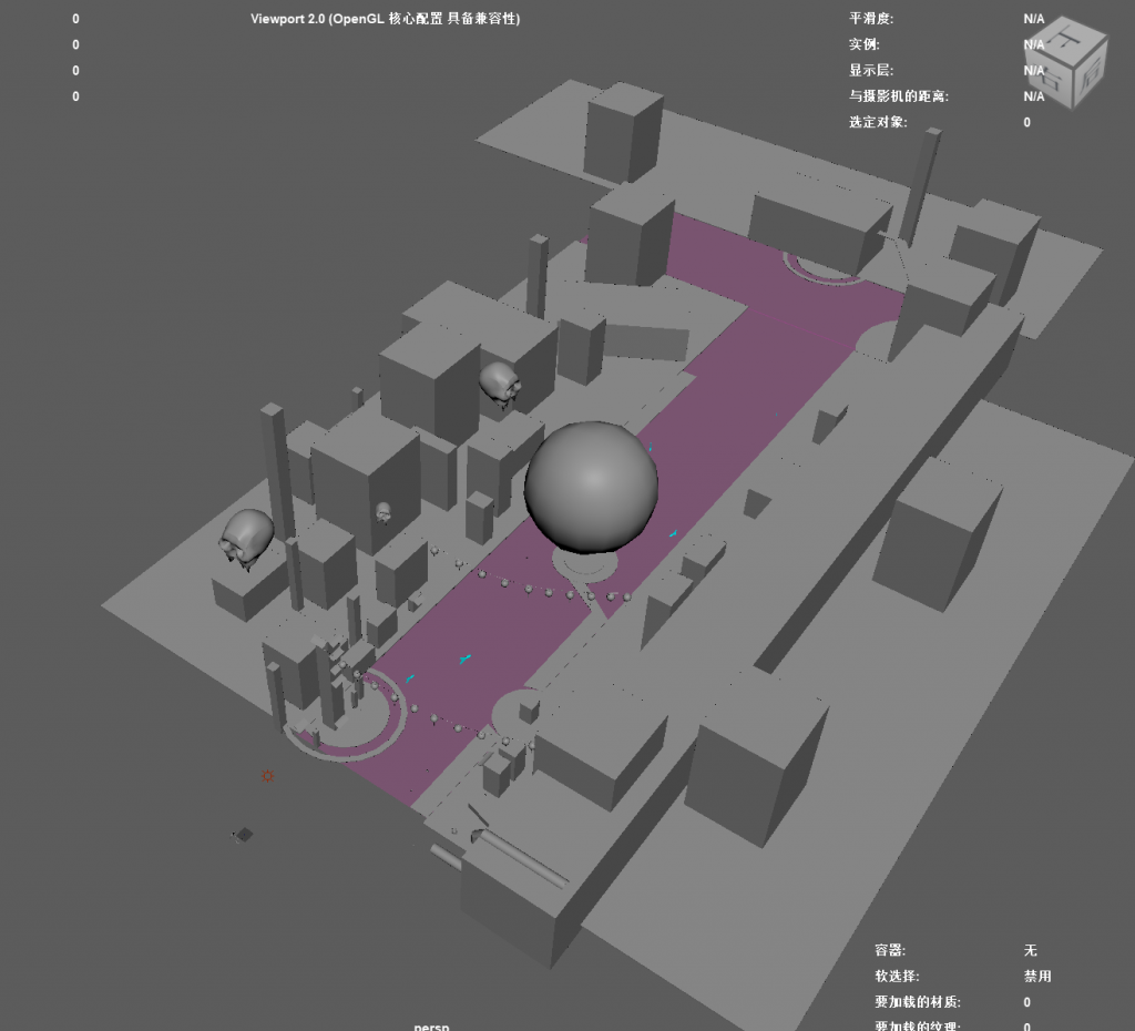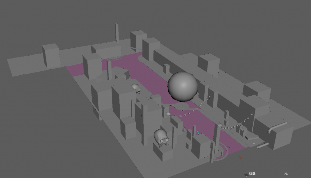 以及,一下的blockout. 从我的角度来说, 看起来很糟糕, 实际上也很糟糕, 因为当时的我并不清楚这些 方块都会代表什么具体的东西, 我只知道他们将会是 一些建筑物,圆球 = main subject (虽然并没有想好是什么, 也许是一只巨大的怪兽或者塔楼?)以及 灯笼 = 监控器 + 连接 两边城市的物品,粉色的Plane=分割两端的河流, 以及我这糟糕的布局, 如此笔直的布局和奇妙的角度, 唯一的优点可能是 至少在这个过程中 我熟悉了 Maya 的简单建模