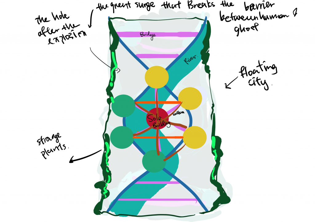 由于我对于布局真的非常非常的苦恼, 我觉得我的 这个blockout 实在是过于丑陋了, 但是我又急于想要给出一个方案 (时间不够了), 所以我像我周围的亲朋好友和老师 寻求方案; 我父亲给了我一个非常有意思的想法, 即, 如果我认为 人和鬼魂是 一体两面的存在, 为什么不用 DNA shape 来表达 他们 是融合在一起的呢? 然后我父亲给我发了很多 DNA 的图片。 我觉得 这个来自于我 父亲的灵感非常的有创新性, 于是我就 come out 了以下 构图 – 还是一条大河 分割了 人类建筑和鬼魂建筑; 鬼魂和人类都居住在浮空岛上面, 他们中间的桥和灯笼组成了DNA shape. 不过我觉得这个concept 可能过于复杂了 + 庞大了,按照我的concept, 光是浮空岛就需要6个。。。所以后面没有采用, 不过有机会的话, 我希望能把 我的灯笼缠绕成DNA 的形状来表达 鬼魂和人类其实 是交融在一起的。