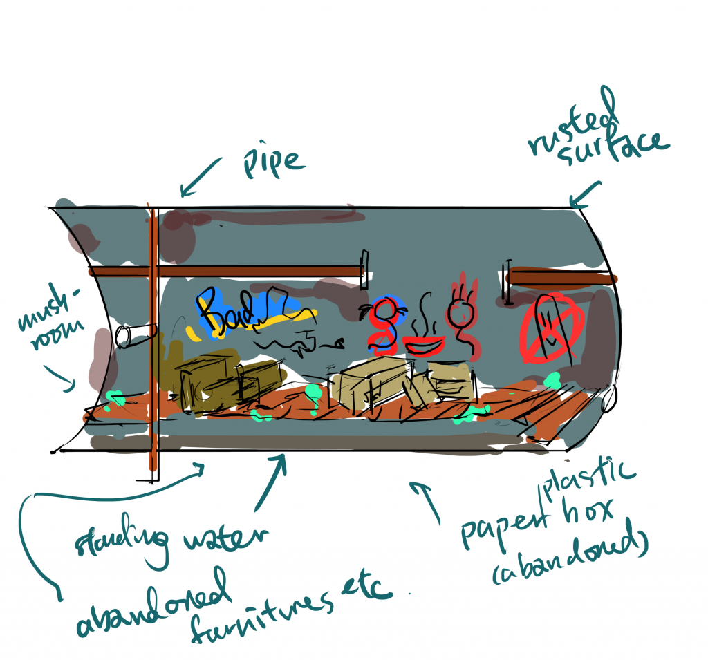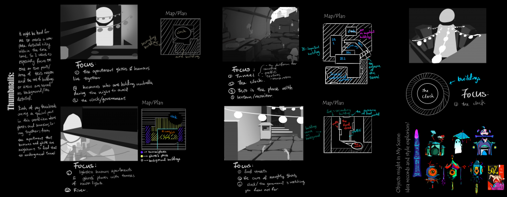 I actually come out with these thumbnails first – 因为当时老师要求的嘛。 我当时想的是, 我想要创造 一座 鬼魂和人类共居的社会, 然后我要聚焦在 特定的城市角落, 比如 小吃街, 比如 一个公寓, 同时我 为每一个concept 都画了 地图, 这是 收到了来自 Amil 的建议 “