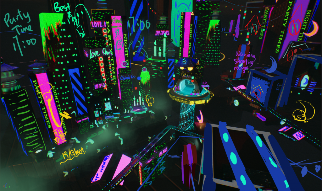对了下面的 小鬼魂是我在最后两天加上去的 – 来自Michael 老师的建议, 加一点让画面生动得东西 – 原本Michael老师说的是, 比如抗议的人群之类的,根据老师的启发 再结合我的 背景故事, 我决定添加一些 举着牌子 正在抗议的鬼魂, 他们 的牌子上 写着 要吃人类之类的话, 我觉得这与 背景中的 peace & love 形成了一个讽刺haha