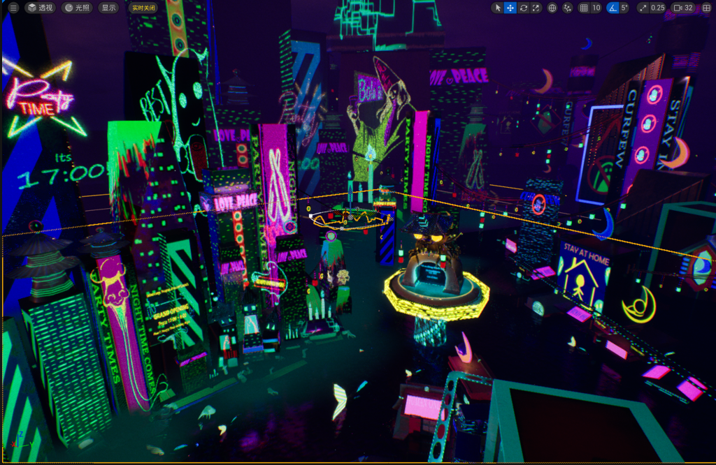 在确定了基础的光影/雾气之后, 我按照我的想象 以及之前做的 cyberpunk 的research 为 我的 scene 添加上了更多细节, 比如 我很喜欢的 厨师 – 这个是在最最最早的 thumbnail 里面就有的, 再比如 表示已经是17点的时间, 表示现在已经到了鬼魂出没的时间啦。 这些基本上都是我先在PS 中画出贴图, 或者在 PNGtree上面下载然后自己改颜色, 然后再在UE5 中贴图~